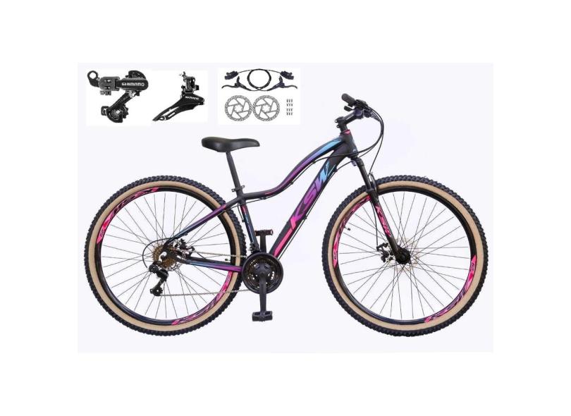 Bicicleta Feminina aro 29 Ksw Mwza 24v Câmbios Shimano Freios Hidráulicos Garfo com Suspensão Pneu Faixa Bege - Preto/Pink/Azul