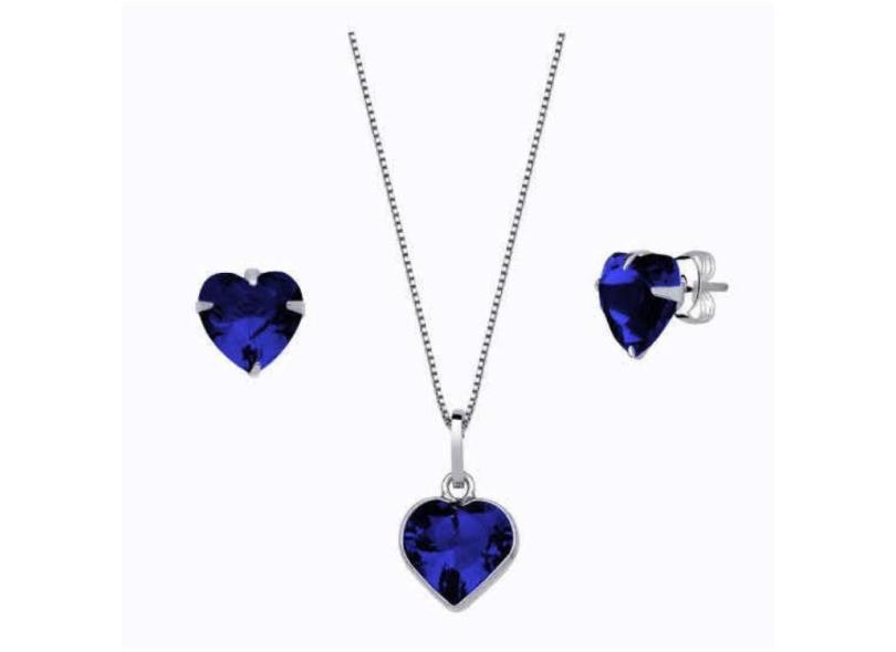 Colar Brinco Infantil Coração Zirconia Prata 925 azul claro
