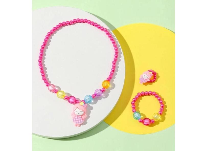 Kit Conjunto Infantil Colar e Pulseira Anel Miçangas Pérola Colorida Pingente Urso Coelho Flor Sereia Doce Borboleta