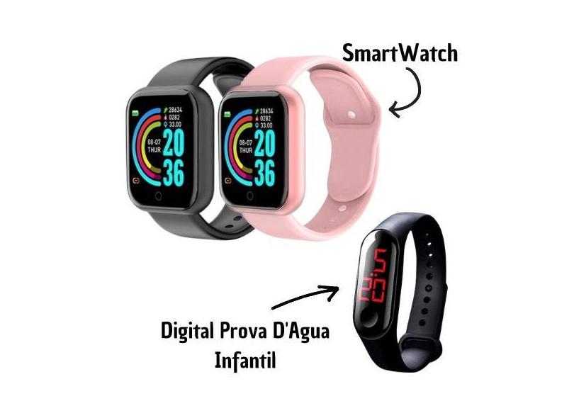 Kit Família - 2 Relógios Smart D20 Preto e Rosa Casal + Bracelete Led Infantil Adulto Mega Premium