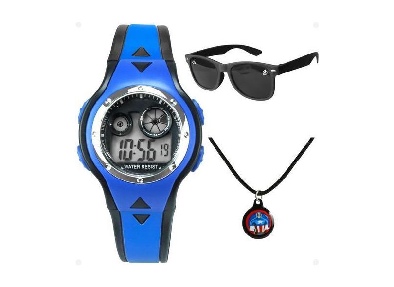 relogio digital azul infantil + colar + oculos proteção uv silicone pr