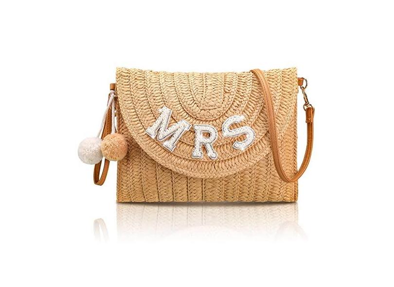 Bolsa de ombro de palha de noiva, carteira envelope tecida, pérola, strass, casamento, férias, lua de mel, presente para noiva, Marrom, One Size