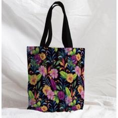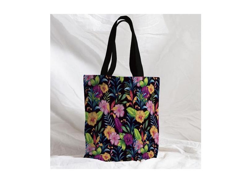 Bolsa Sacola Artesanal de Tecido Flores e Folhas Tropicais Fundo Preto