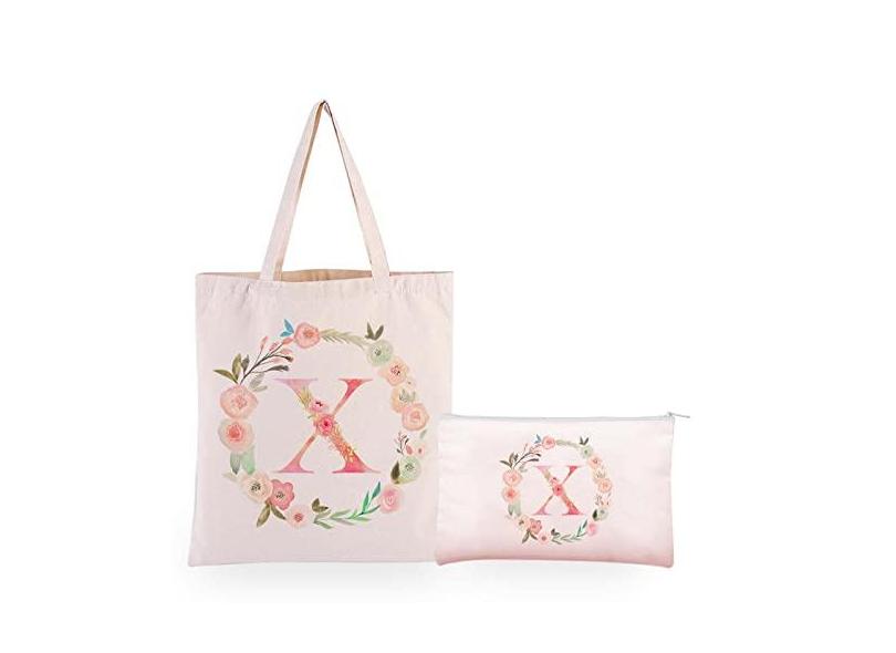 boutikpro Sacola de lona com inicial personalizada floral com monograma com zíper, bolsa cosmética, presente para damas de honra, Branco