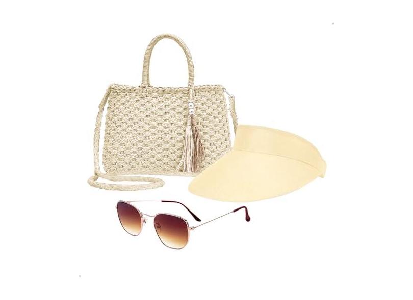 Kit Bolsa de Palha Feminina + Viseira Para Sol + Óculos de Sol Para Praia Verão Moda (Areia+Marrom)