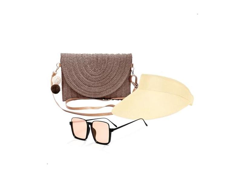 Kit Bolsa de Palha Feminina + Viseira Solar e Óculos de Sol Grande Verão Piscina Moda Praia (Marrom)