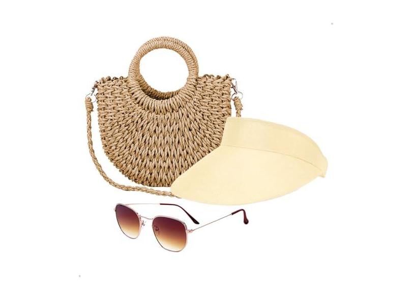 Kit Bolsa de Palha Feminina + Viseira Solar e Óculos de Sol Verão Piscina Moda Praia (Bege+Marrom)