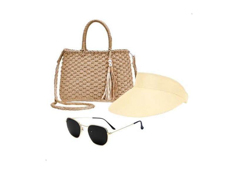 Kit Bolsa de Palha Feminina + Viseira Solar + Óculos de Sol Para Praia Moda Verão (Bege+Preto)