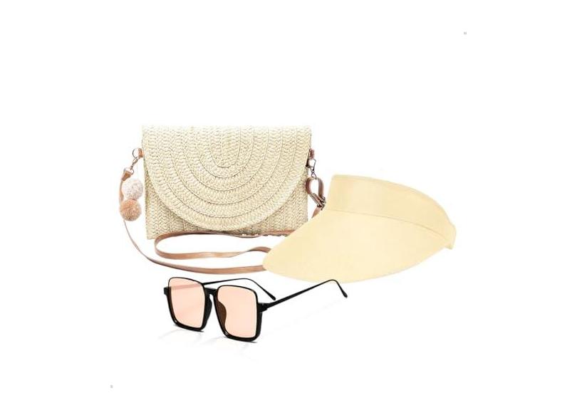 Kit Bolsa de Palha + Viseira Solar Feminina e Óculos de Sol Grande Verão Piscina Moda Praia (PALHA)