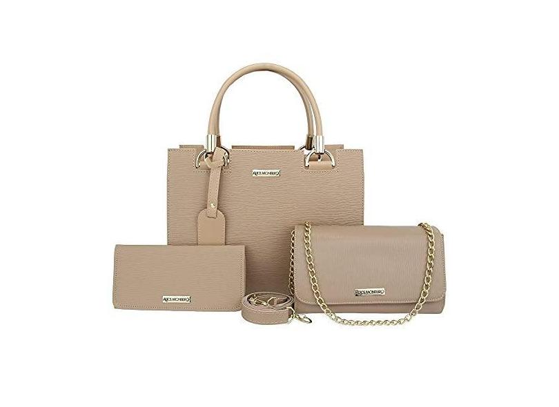 Kit Bolsa Feminina Castelo + Clutch Alça de Corrente + Carteira Alice Monteiro Cor:Bege;Tamanho:Único;Gênero:Feminino