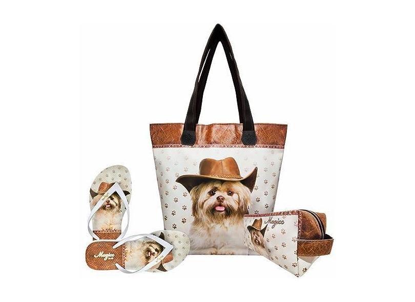 Kit Pet Feminino Cachorro com Chapéu com Bolsa, Necessaire e Chinelo, Magicc