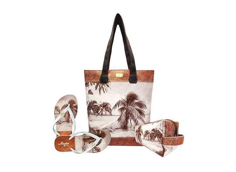 O menor preço encontrado no Brasil para Kit Praia Feminino Coqueiros Marrom com Bolsa, Necessaire e Chinelo, Magicc KIT-051 atualmente é R$ 137,90.