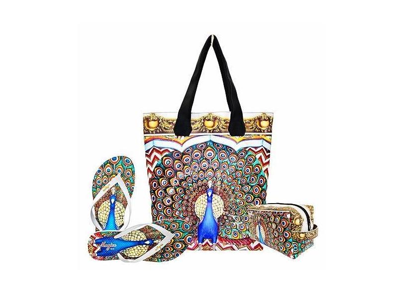 Kit Tropical Feminino Pavão Azul com Bolsa, Necessaire e Chinelo, Magicc KIT-091