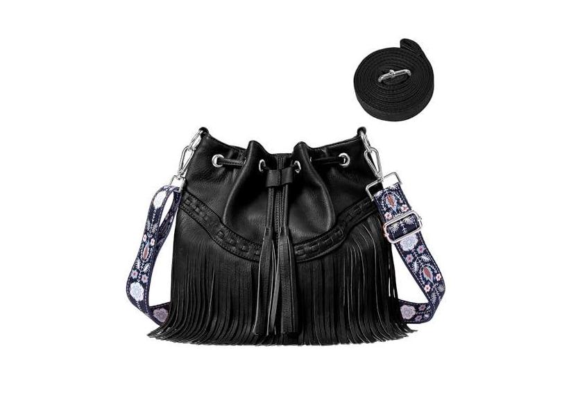 Sunwel Fashion Bolsa feminina estilo Hobo com franja, bolsa ocidental, couro vegano, borla, hippie, bolsa tiracolo, Preto