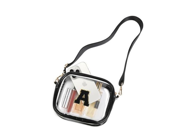TEBIEKOY Bolsa pequena transparente aprovada para estádio bolsa transversal transparente com patch de letra inicial para shows de jogos esportivos de meninas adolescentes, Preto