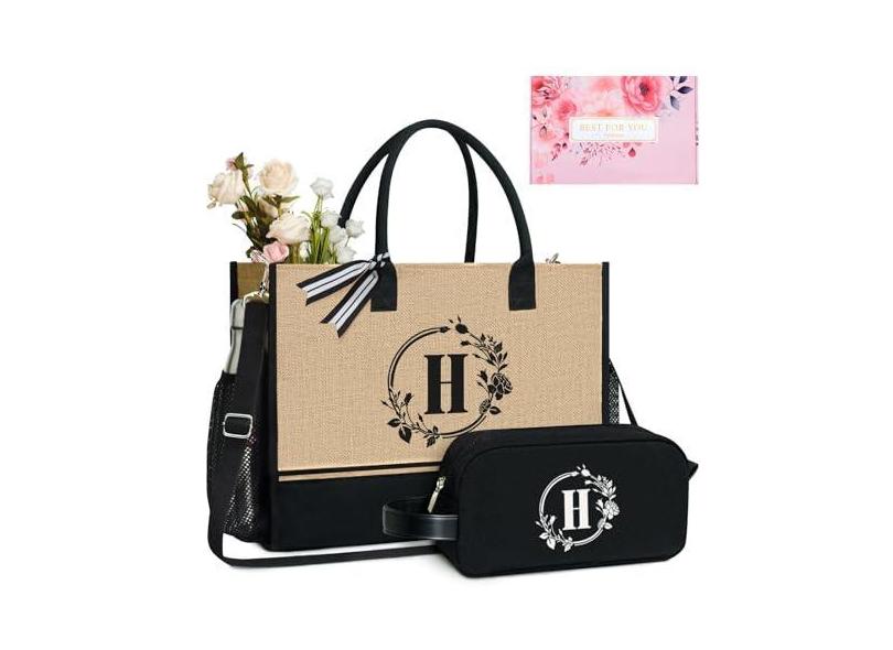 TOPDesign Bolsa de juta com inicial personalizada com 5 bolsos, fecho de zíper superior, conjunto de presente de aniversário para mulheres, mães, professores, Preto e marrom, Large