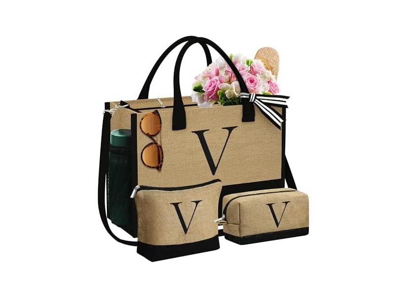 YOOLIFE Sacola de juta com inicial e 2 bolsas de maquiagem com zíper personalizado para mãe presentes de aniversário para melhor amiga para mulheres, Cinza, Medium