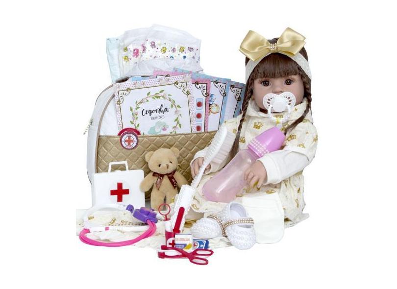 Bebê Reborn Menina Baby Cabelos Castanhos Bolsa Maternidade - Cegonha