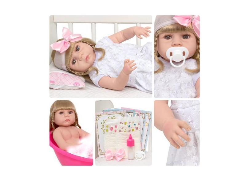 Bebê Tipo Reborn Menina Loira Fofa Vestido Branco Acessórios - Cegonha