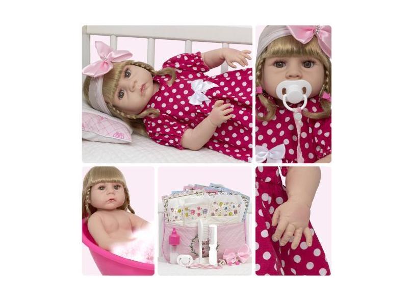Boneca Reborn Menina Realista Loira Vestido Bolinha 20 Itens - Cegonha