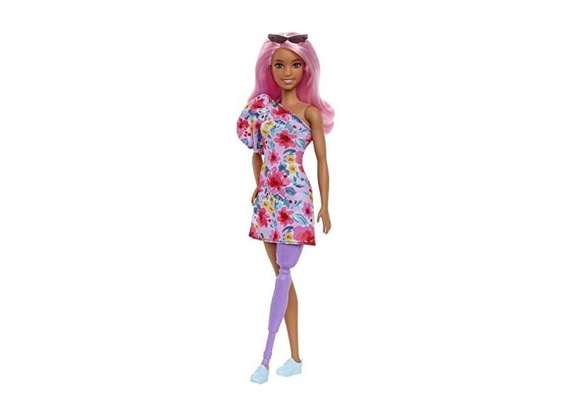 Boneca Barbie Fashionistas 189, Cabelo Rosa, Vestido Floral, Óculos de Sol, Perna Prótese, Ténis, Brinquedo 3-8 Anos.