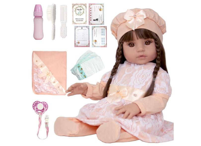 Boneca Bebe Reborn Emilia Roupa Salmão com Enxoval Completo