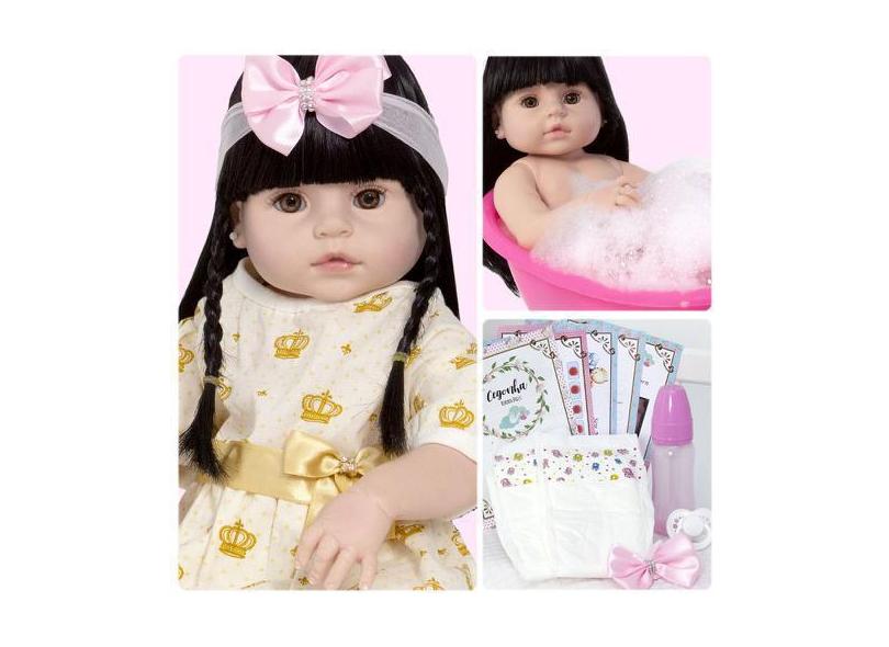Boneca Bebê Reborn Menina Morena Vestido Dourado Acessórios - Cegonha