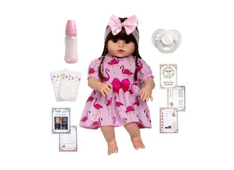 Boneca Bebe Tipo Reborn Olho Castanho Vestido Flamingo Lindo - Cegonha