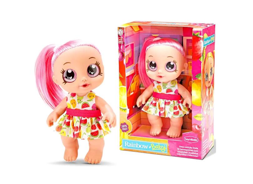 Boneca Rainbow Baby Moranguinho Frutinha 100% Vinil Zoiuda Cabelo Rosa