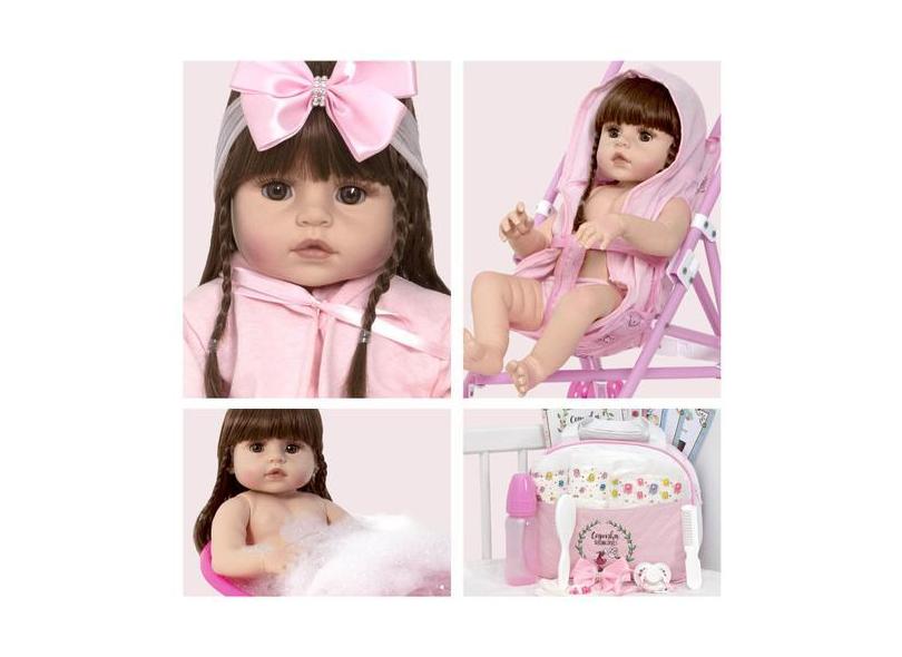 Boneca Reborn Cabelo Castanho Bolsa Acessórios + Carrinho - Cegonha Re
