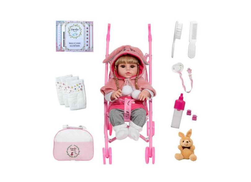 Boneca Reborn Com Carrinho Coelho De Pelúcia Bolsa Enxoval - Cegonha R