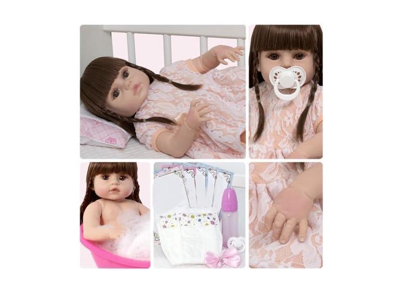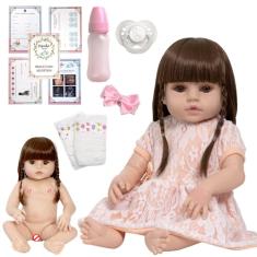 Boneca Reborn de Silicone Cabelo Castanho Linda 13 Itens