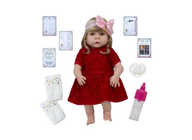 Boneca Reborn Gatinha Vestido Vermelho + Kit Acessórios - Cegonha Rebo