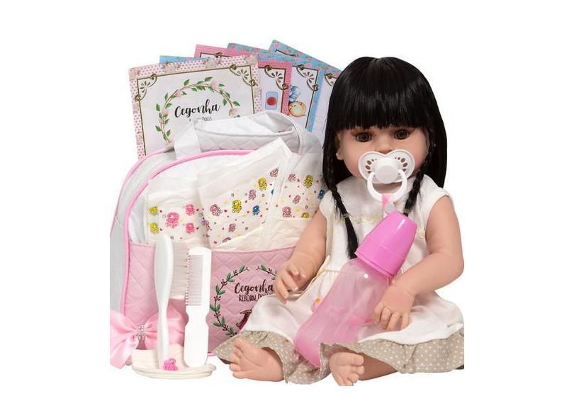 Boneca Reborn Grande Cabelo Longo Morena Fofa Bolsa Itens - Cegonha Re