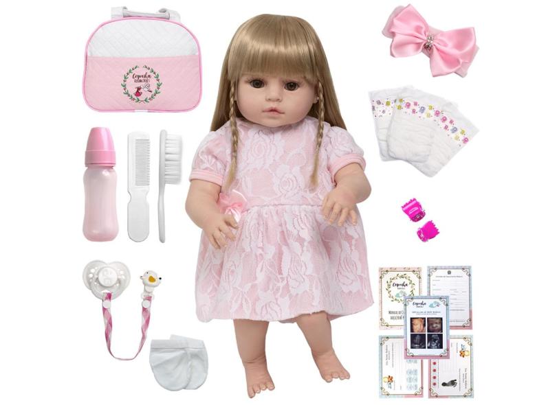 Boneca Reborn Loira 100% Silicone Vestido Rosa + Kit Itens
