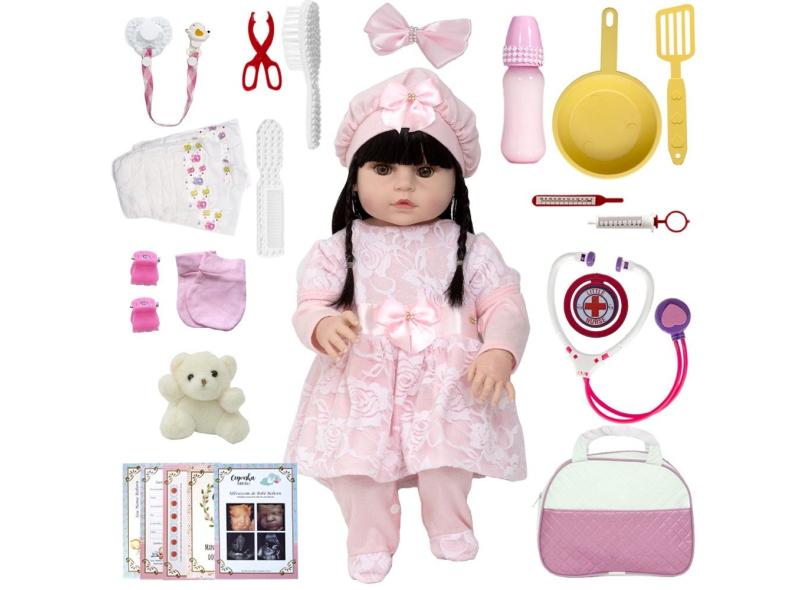 Boneca Reborn Menina Morena Pode Dar Banho Enxoval Completo