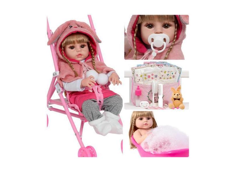 Boneca Reborn Recém Nascida Coelhinha Carrinho Vários Itens - Cegonha