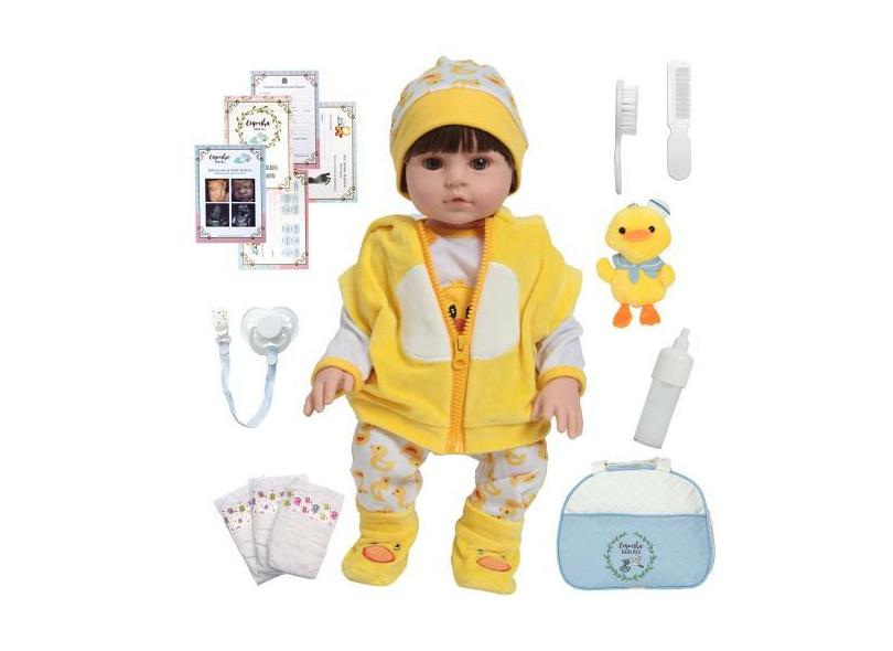 Boneco Bebê Reborn Patinho Bolsa Itens Pelúcia 46cm Fofinho - Cegonha