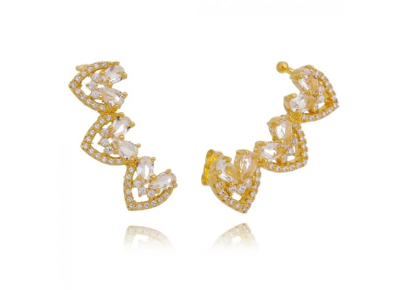 Brinco 3 Corações Cravejado em Zircônia e Navete Incolor Folheado em Ouro 18k