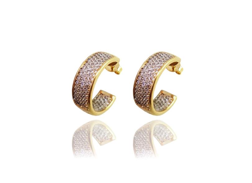 Brinco Argola Larga Cravejada Microzirconias Detalhes Ródio Branco Banhado A Ouro 18K