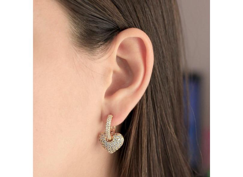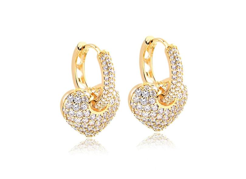 Brinco de argolinha c/ coração cravejado folheado em ouro