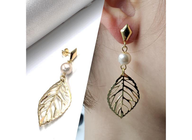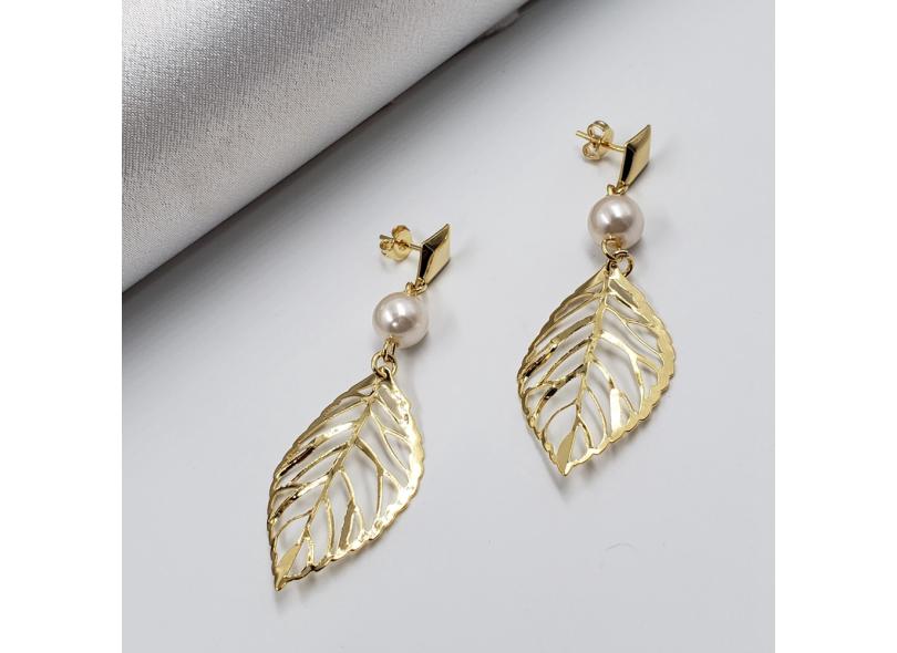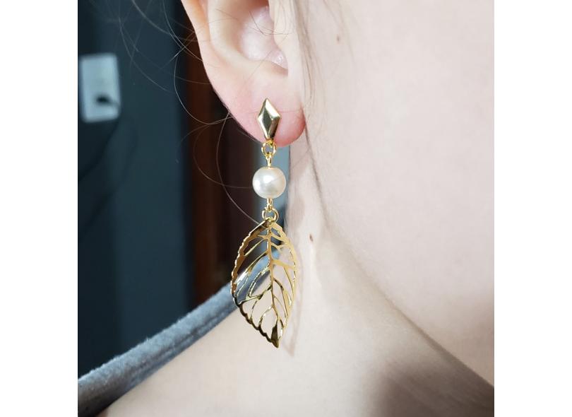 Brinco Pendente Perola com Pingente Folha Banho Ouro