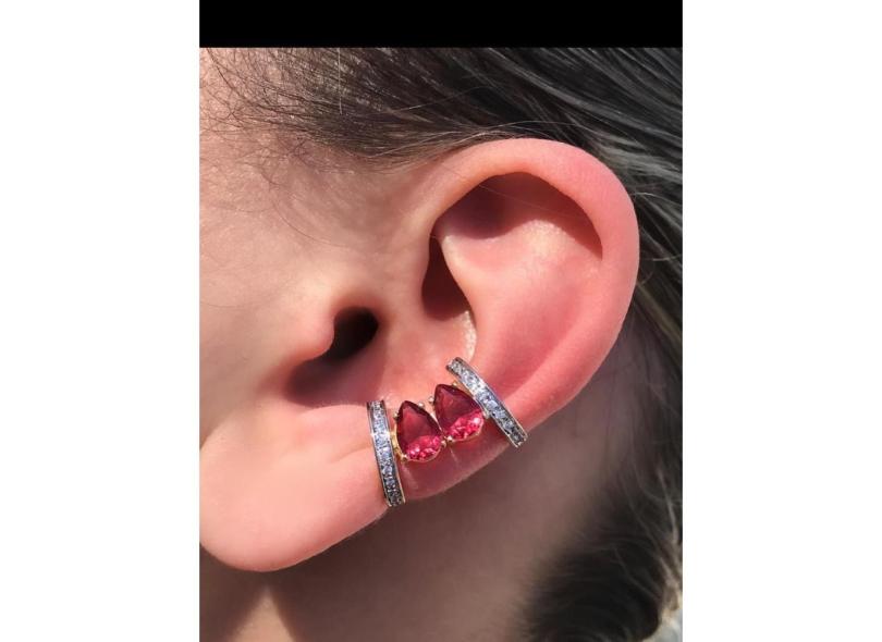 Brinco Piercing Fake Orelha Rosa Cravejado Folheado Ouro Par