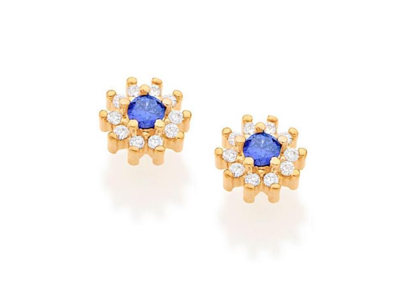 Brinco Rommanel Banhado A Ouro Pequena Flor Com Zircônias Branco E Azul 525721