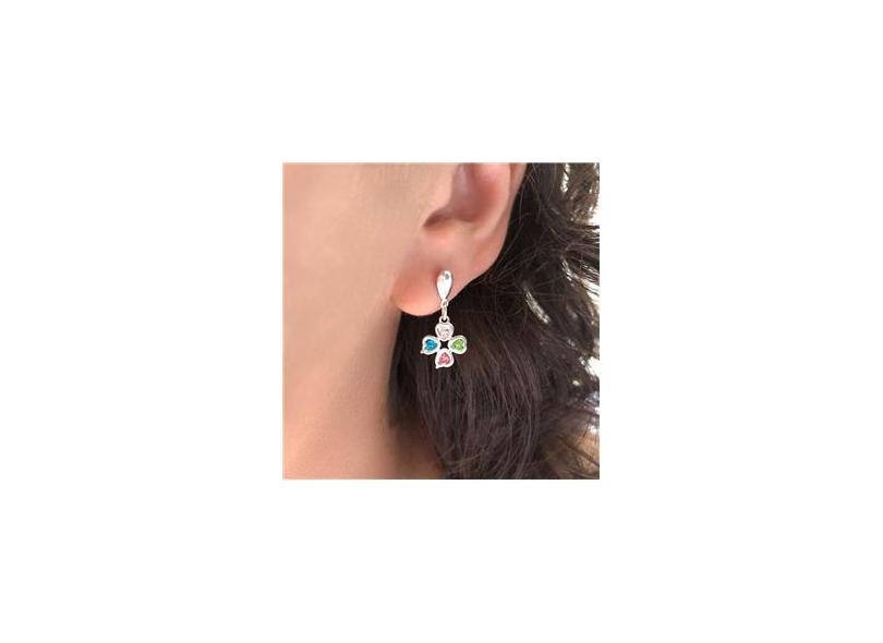 Brinco Trevo da Sorte Quatro Corações Zirconia Colorida Folheada a Prata