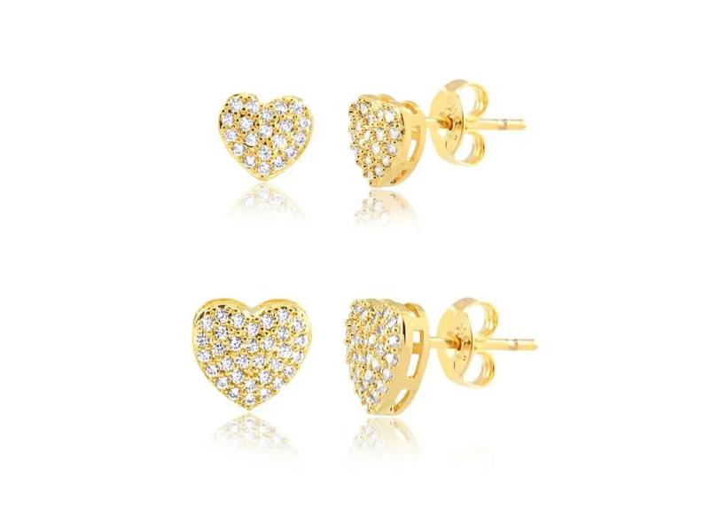 Kit de brincos dois corações cravejado de zircônia folheado em ouro 18k