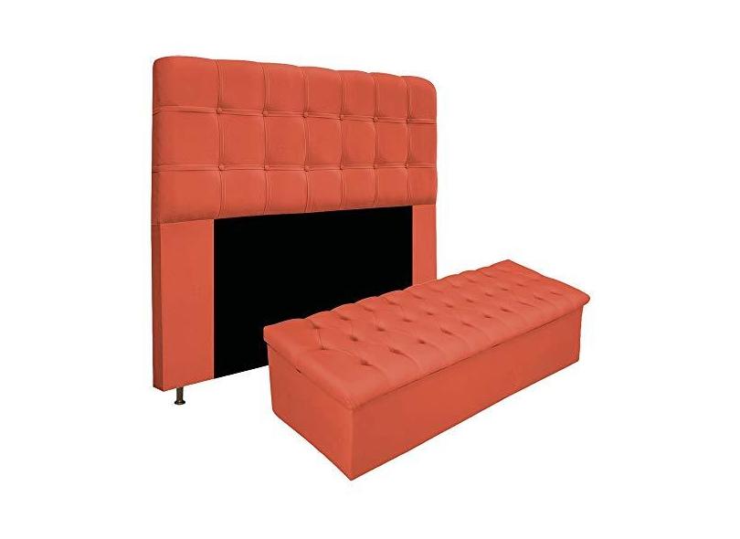 Kit Cabeceira e Calçadeira Baú Estofada Mel 140 cm Casal Com Botonê Suede Terracota - Doce Sonho Móveis