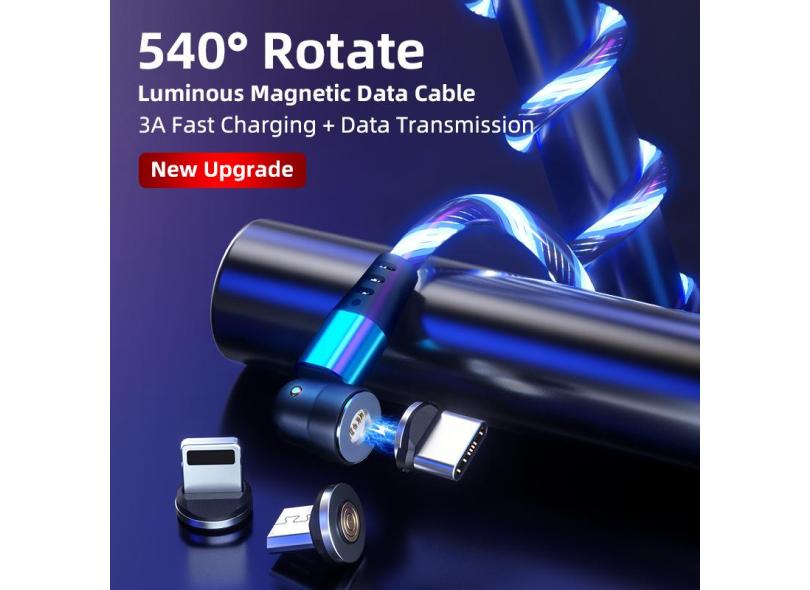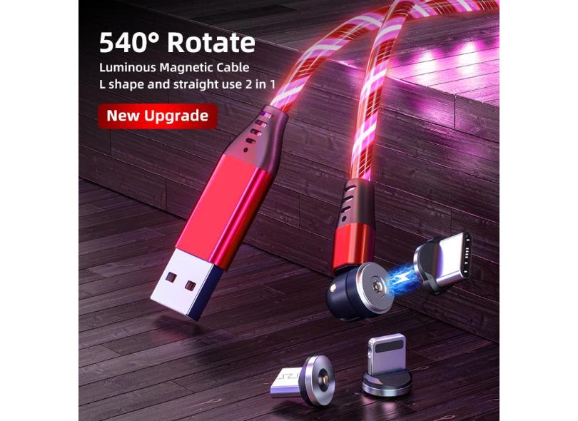 3a fluindo luz led cabo magnético usb c cabo qc3.0 cabo de carregamento rápido 540 girar micro tipo