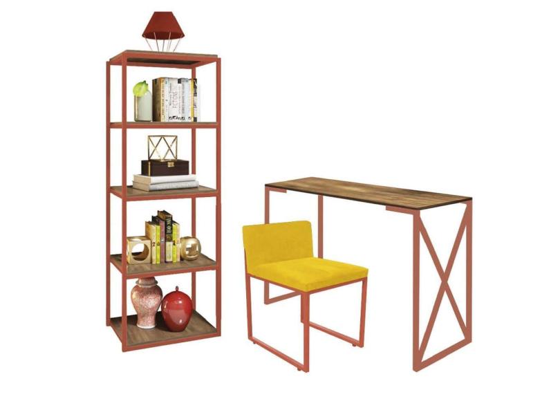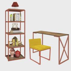 Kit Escritório Bex 1 Cadeira Corino Amarelo com 1 Mesa e 1 Livreiro Ferro Bronze MDF Carvalho - Ahazzo Móveis