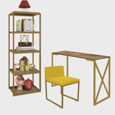 Kit Escritório Bex 1 Cadeira Corino Amarelo com 1 Mesa e 1 Livreiro Ferro Dourado MDF Freijó - Ahazzo Móveis